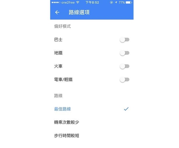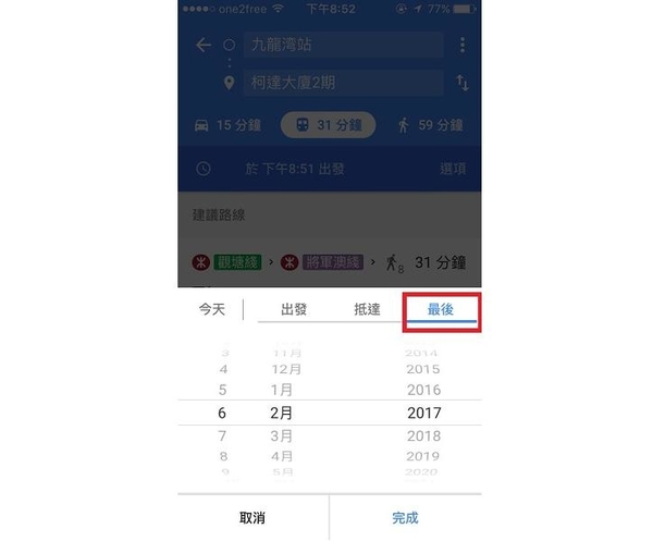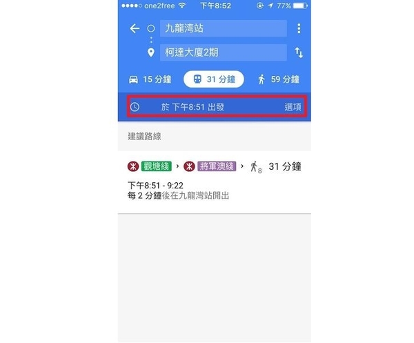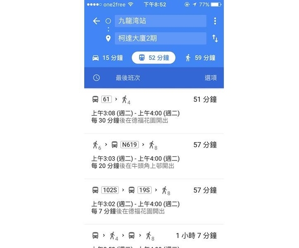 在 Google Maps 中輸入了想去的地方並搜尋路線後,選擇交通工具,並按「於幾點出發」的選項,便能設定自己想要的出發時間。亦有「最後」選項讓你看看不同路線的尾班車,「最後班次」旁的選項亦能讓你篩選偏好不同的交通工具。
