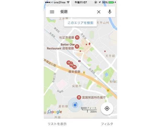 Google Maps 中有搜尋附近設施的功能,例如輸入「餐廳」或「Cafe」,就能搜尋自己附近或者地圖顯示位置附近的餐廳或咖啡店。除了大包圍搜索,輸入關鍵字都可以,例如輸入「心齋橋 鳥貴族」,就能看到位於心齋橋附近這家連鎖居酒屋的分店了。去旅行時想突然餓了或口渴都能派上用場呢。