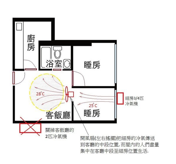 首先,你要有一把風扇,仲要識「擺位」兼「走位」。bbu2 表示:「關掉客飯廳的 2 匹冷氣機,開風扇把細房的冷氣傳送到客廳的中段位置, 而屋內的人們盡量集中在客廳中段至細房位置生活.」他並指:「附圖說明, 大家可在你們家中模仿, 再分享你們使用心得」